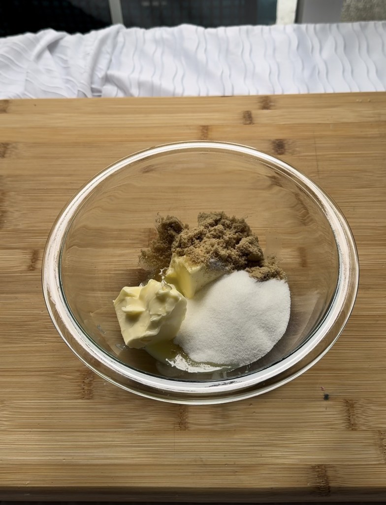 in a medium bowl, using a hand beater, whip the stick of butter with the brown and white sugar for about 1-2 minutes until it is light and fluffy.
