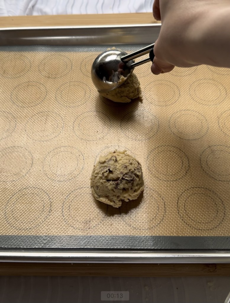 scoop out the dough with an ice cream scoop spacing the dough out generously.